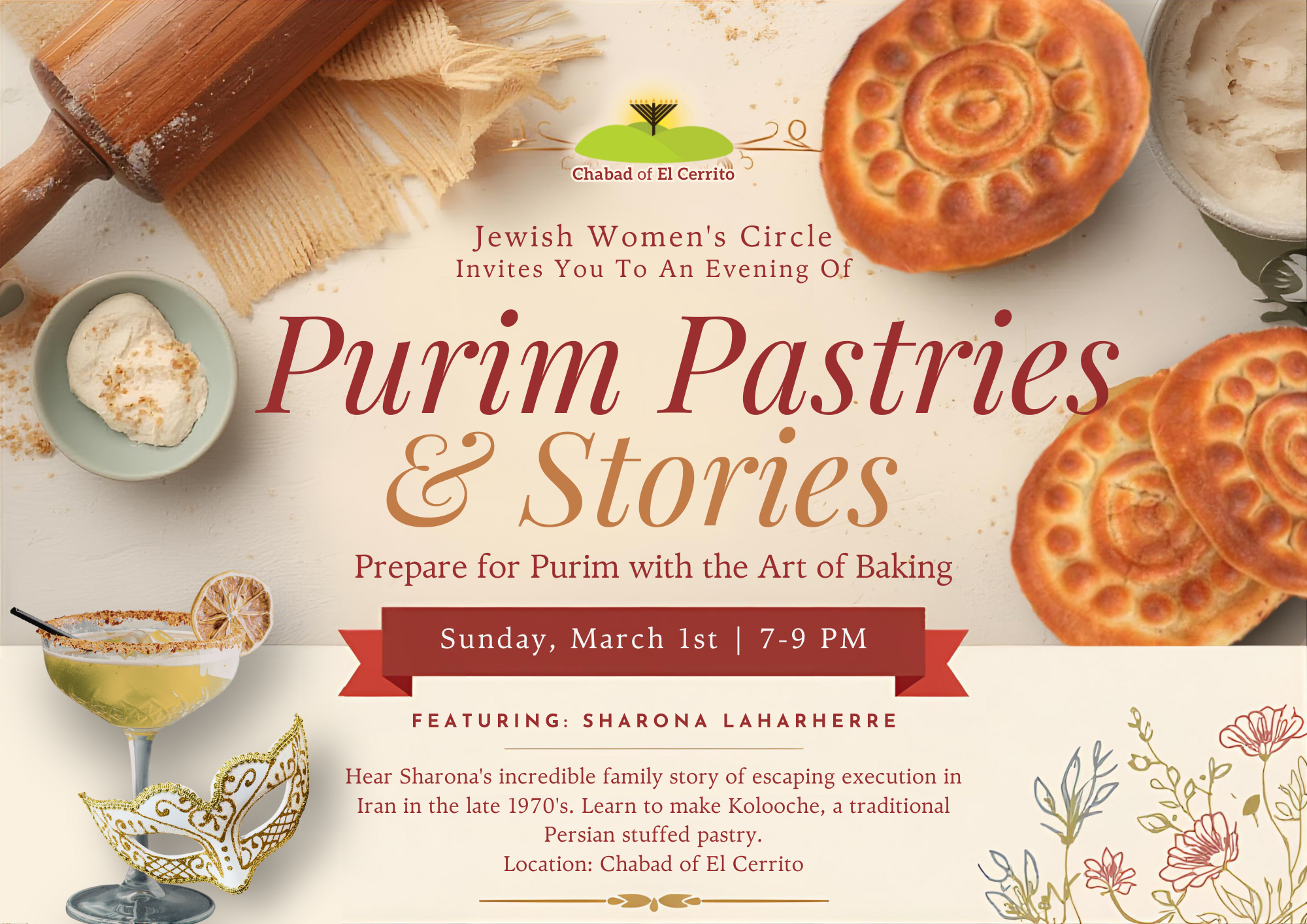 Join the Jewish Women’s Circle for a meaningful and delicious evening as we prepare for Purim through the art of baking and storytelling. Learn how to make traditional Persian kolooche while hearing Sharona Laherherre’s powerful family story of courage and survival.
